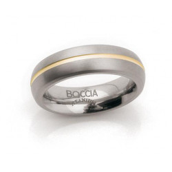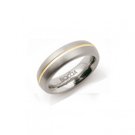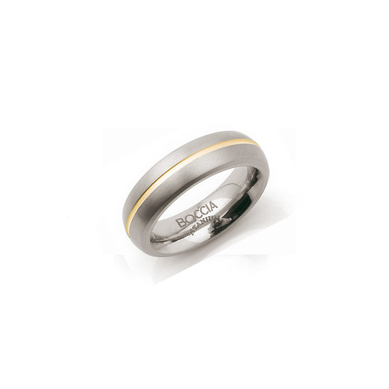 Titanio sólido. Titanio pulido en el interior. Anillo de titanio abovedado. Un diseño simple y atemporal, un borde dorado mate está cincelado en toda su longitud. El interior está redondeado y pulido para comodidad de los dedos. Todos los componentes de titanio de los relojes, joyas y accesorios Boccia están hechos de titanio puro (a menos que se indique lo contrario). El titanio es agradable para la piel, anti alérgico, ligero y resistente.