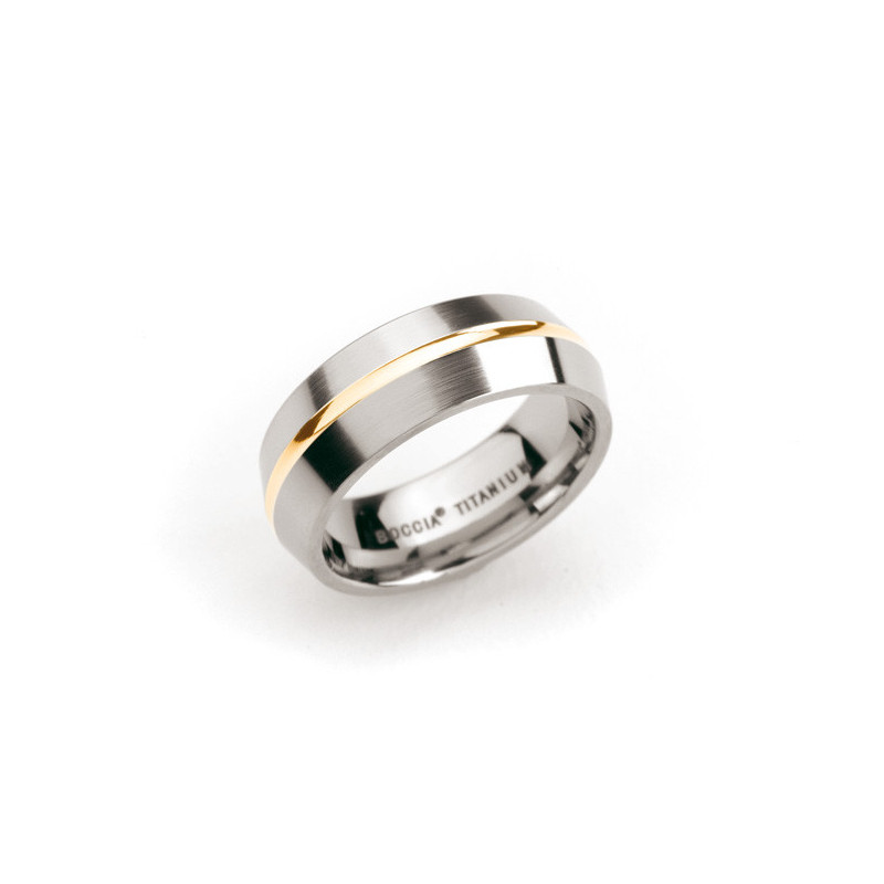 Esta joya moderna y elegante está completamente pulida. El oro 14k (585/°°) y el titanio puro iluminan su mano en una combinación de colores únicos y brillantes. El interior está redondeado y pulido para una máxima comodidad. Todos los componentes de titanio de los relojes, joyas y accesorios de Boccia están hechos de titanio puro (a menos que se indique lo contrario). El titanio es agradable para la piel, anti alergico, ligero y resistente.