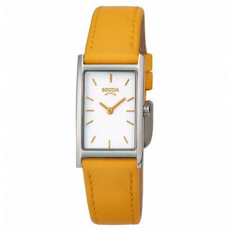 La caja de este reloj es de titanio puro y tiene un tamaño de 20 x 33 mm. Tiene marcas y agujas plaqueadas en oro. Correa en piel negra. Movimiento de cuarzo japonés. Vidrio mineral. Resistente al agua hasta 5 BAR (165 pies o 50 metros). Los relojes Boccia son todos de titanio sólido, no están chapados en titanio. El titanio es hipoalergénico y muy agradable para la piel. Cuando los relojes Boccia vienen con una correa de cuero, la hebilla también es de titanio macizo.
