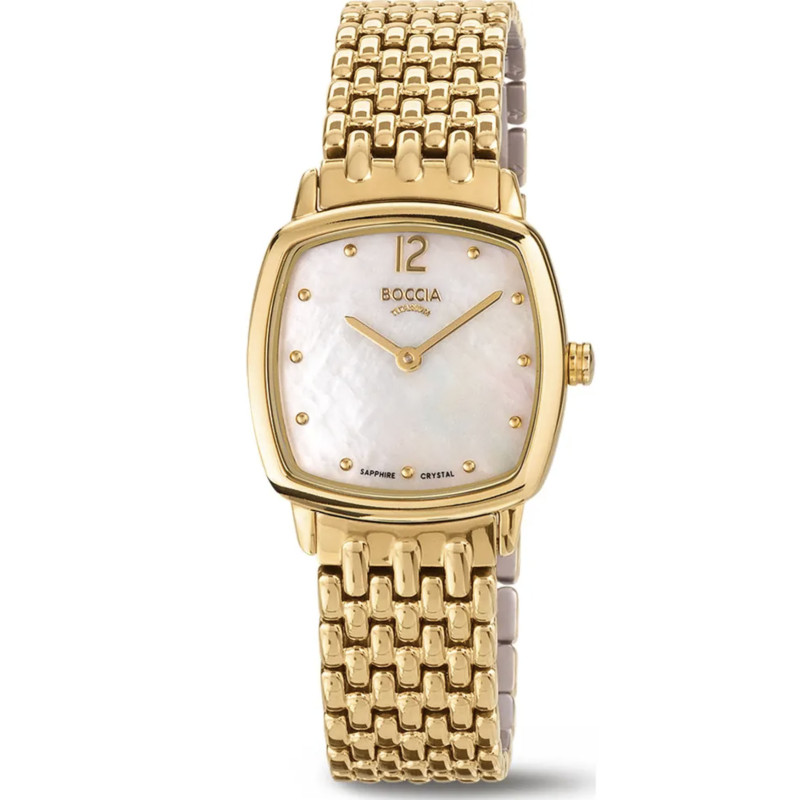 Reloj Boccia de titanio con esfera nácar, caja de titanio chapado en oro pulido, agujas y marcadores de oro, brazalete de malla ajustable de titanio chapado en oro. Cristal de safira. Movimiento de cuarzo japonés. Resistente al agua hasta 5 bar (50 metros). Los relojes Boccia son todos de titanio sólido, no chapados en titanio. El titanio es hipoalergénico y muy bueno para la piel. Cuando los relojes Boccia vienen con brazalete, la hebilla también es de titanio macizo.