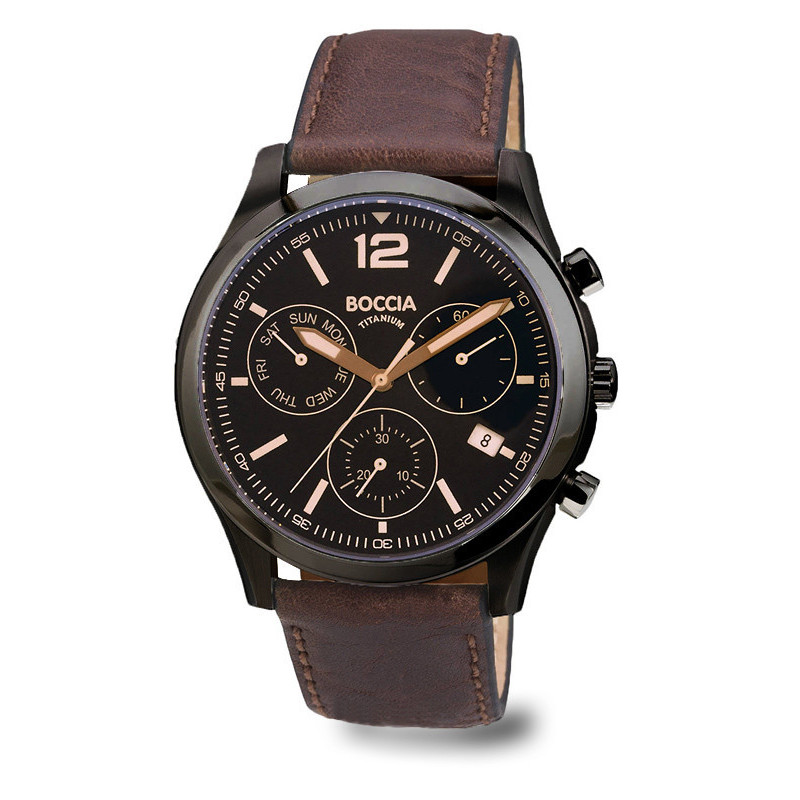 Reloj cronógrafo Boccia Titanium con diales de cronógrafo / día / fecha. Caja de titanio negro mate y pulido, esfera marrón oscuro, marcadores de color canela, correa de piel marrón. Resistente al agua hasta 10 bar (330 pies). Cristal mineral. Movimiento de cuarzo suizo