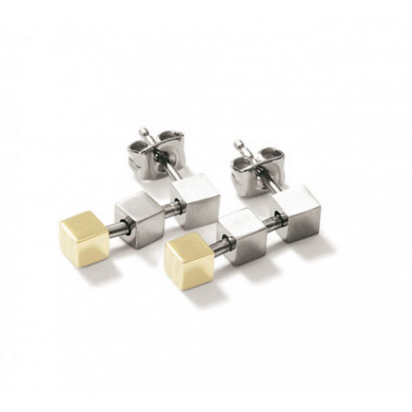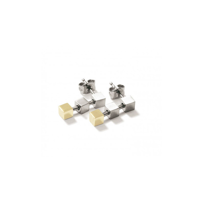Boucles en titane brossé et titane plaqué or. Les couleurs froides du titane et les couleurs chaudes de l'or se mélangent avec style. Les petits cubes sont légèrement articulés. Fermoir en titane. Tous les composants en titane des montres, bijoux et accessoires Boccia sont en titane pur (sauf indication contraire).